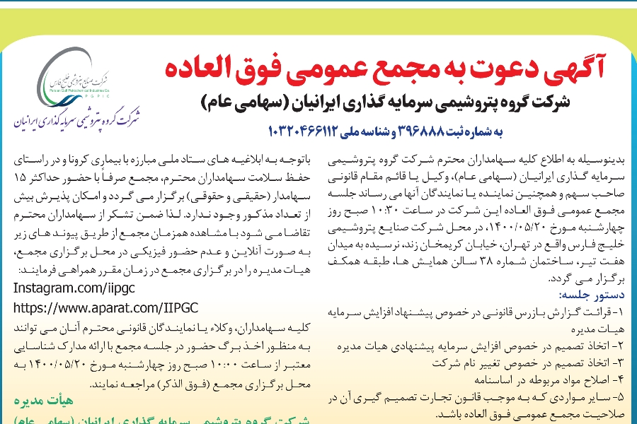 بدینوسیله به اطلاع کلیه سهامداران محترم شرکت گروه پتروشیمی سرمایه گذاری ایرانیان (سهامی عام)، وکیل یا قائم مقام قانونی صاحب سهم و همچنین نماینده یا نمایندگان آنها میرساند جلسه مجمع عمومی فوق العاده این شرکت در ساعت 10:30 صبح روز چهارشنبه مورخ 20/05/1400، در محل شرکت صنایع پتروشیمی خلیج فارس واقع در تهران، خیابان کریمخان زند، نرسیده به میدان هفت تیر، ساختمان شماره 38 سالن همایش ها، طبقه همکف برگزار میگردد.