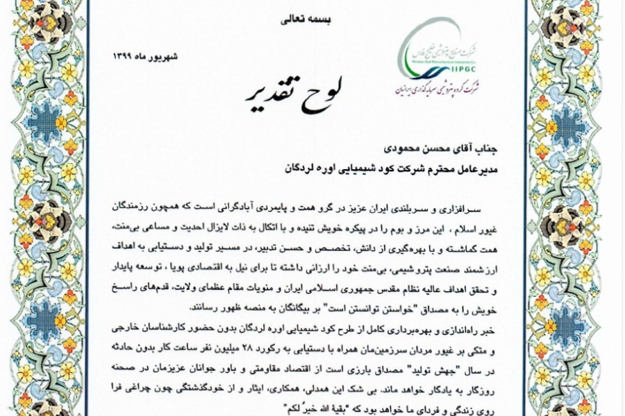 اینجانب و خانواده معزز شرکت گروه پتروشیمی سرمایه گذاری ایرانیان (پترول) به مصداق حدیث شریف مَن لَم يَشكُرِ المَخلوقَ لَم يَشكُرِ الخالِقَ از اقدامات شایسته آن برادر گرامی، مدیران و همکاران محترم شرکت پتروشیمی ارومیه، قدردانی نموده، سعادت و بهروزی و توفیق روز افزونتان را از درگاه ایزد منان مسئلت می نماییم.