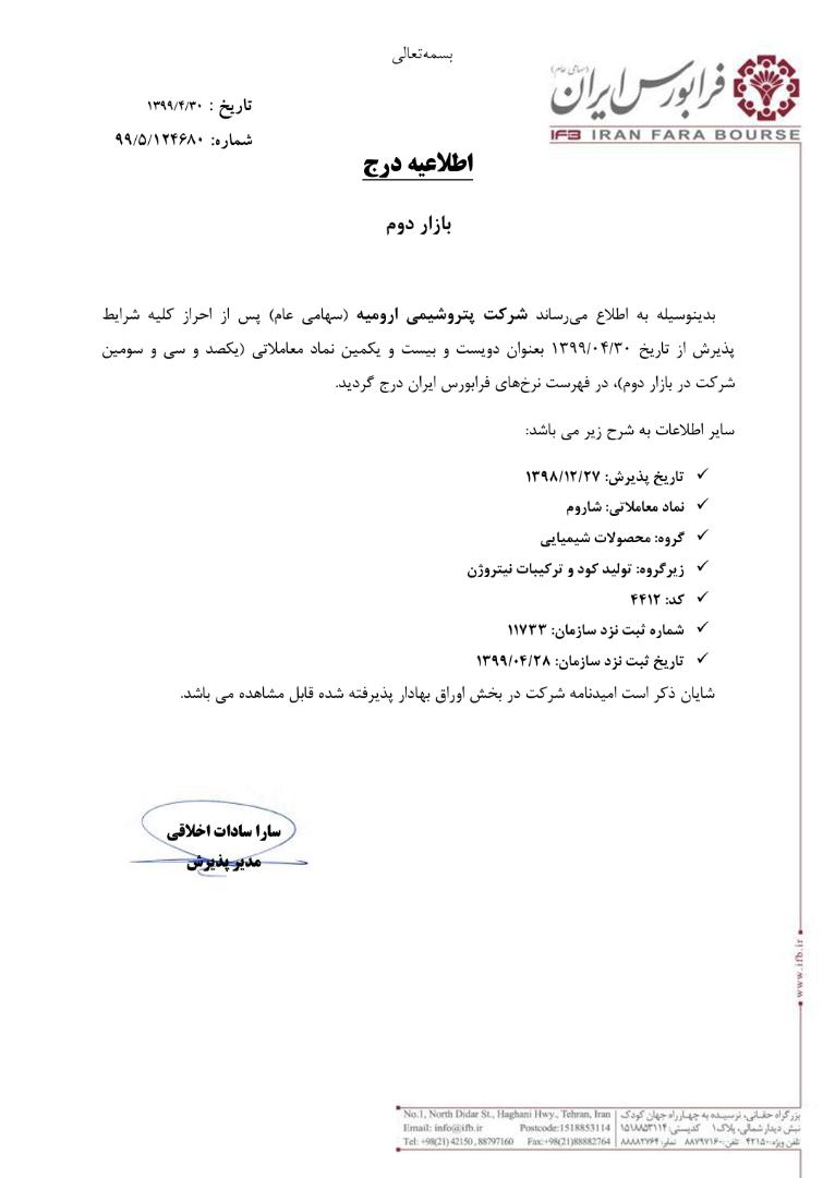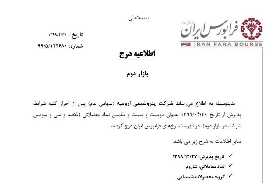 پتروشیمی ارومیه با نماد "شاروم" در بازار دوم فرابورس درج نمادشد.