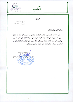 " جناب آقای بهنام عاجلو نظر به تعهد، تخصص و تجارب ارشمند جنابعالی ، به موجب این حکم به عنوان سرپرست مدیریت طرح های شرکت گروه پتروشیمی سرمایه گذاری ایرانیان منصوب می گردید.امید است با استعانت از پروردگار متعال و بهره مندی از تجربیات گرانقدرتان در انجام امور محوله و تحقق اهداف عالیه شرکت موفق و موید باشید
