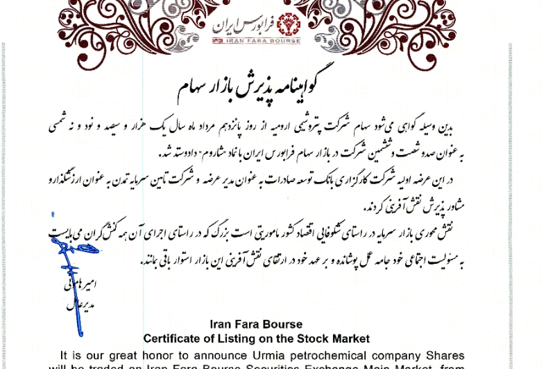گواهینامه پذیرش پتروشیمی ارومیه در بازار سهام