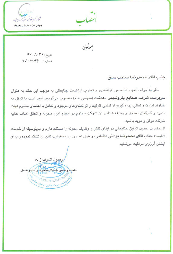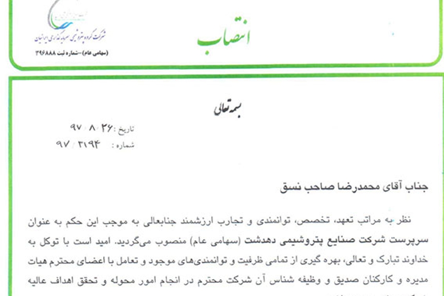 به موجب این حکم آقاي صاحب نسق به عنوان سرپرست شرکت پتروشیمی دهدشت منصوب گردید