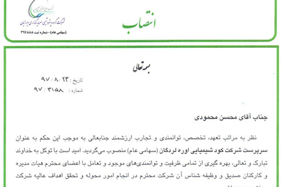 به موجب این حکم آقاي محمودي به عنوان سرپرست شرکت كود شيميائي اوره لردگان منصوب گردید