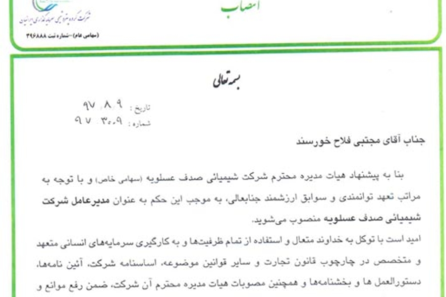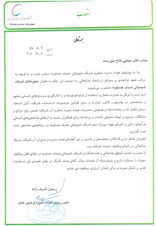 به موجب این حکم آقاي فلاح خورسند به عنوان مديرعامل شركت شيميائي صدف عسلويه منصوب گردید