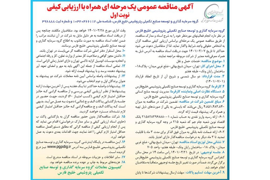 گروه سرمایه گذاری و توسعه صنایع تکمیلی پتروشیمی خلیج فارس در نظر دارد انجام فعالیتهای موردنظر خود را به شرح اسناد و مدارک مناقصه، از طریق مناقصه عمومی یک مرحلهای براساس ارزیابی کیفی مناقصه گران به اشخاص حقوقی واجد شرایط واگذار نماید. لذا از متقاضیان دعوت می شود حداکثر تا تاریخ 07/03/1401 جهت دریافت اسناد مناقصه به آدرس ذیل به همراه معرفینامه معتبر از شرکت مربوطه مراجعه نمایند.