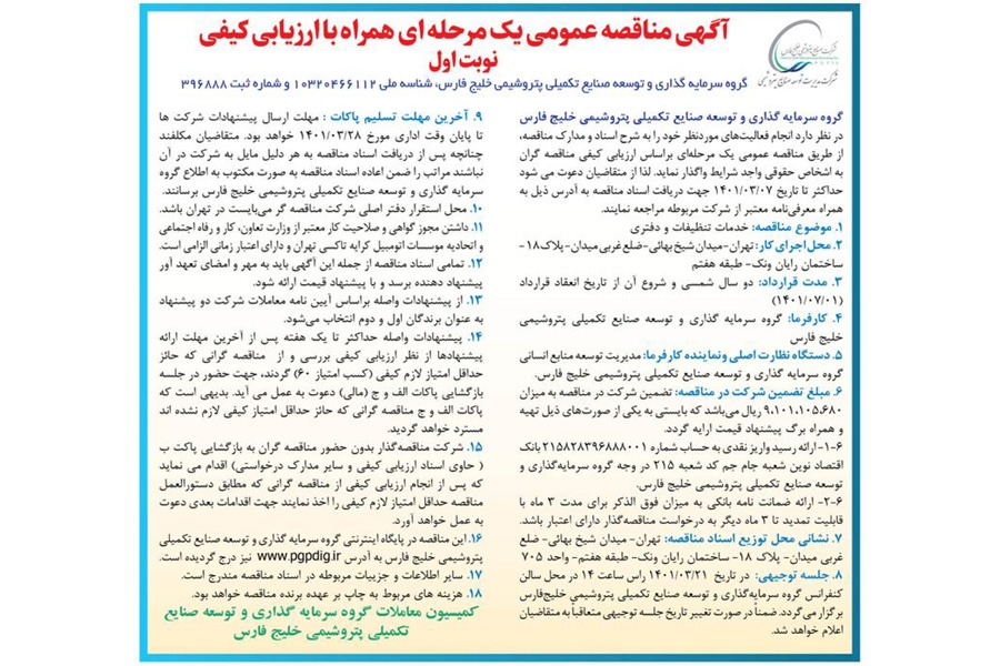 گروه سرمایه گذاری و توسعه صنایع تکمیلی پتروشیمی خلیج فارس در نظر دارد انجام فعالیتهای موردنظر خود را به شرح اسناد و مدارک مناقصه، از طریق مناقصه عمومی یک مرحلهای براساس ارزیابی کیفی مناقصه گران به اشخاص حقوقی واجد شرایط واگذار نماید. لذا از متقاضیان دعوت می شود حداکثر تا تاریخ 07/03/1401 جهت دریافت اسناد مناقصه به آدرس ذیل به همراه معرفینامه معتبر از شرکت مربوطه مراجعه نمایند.