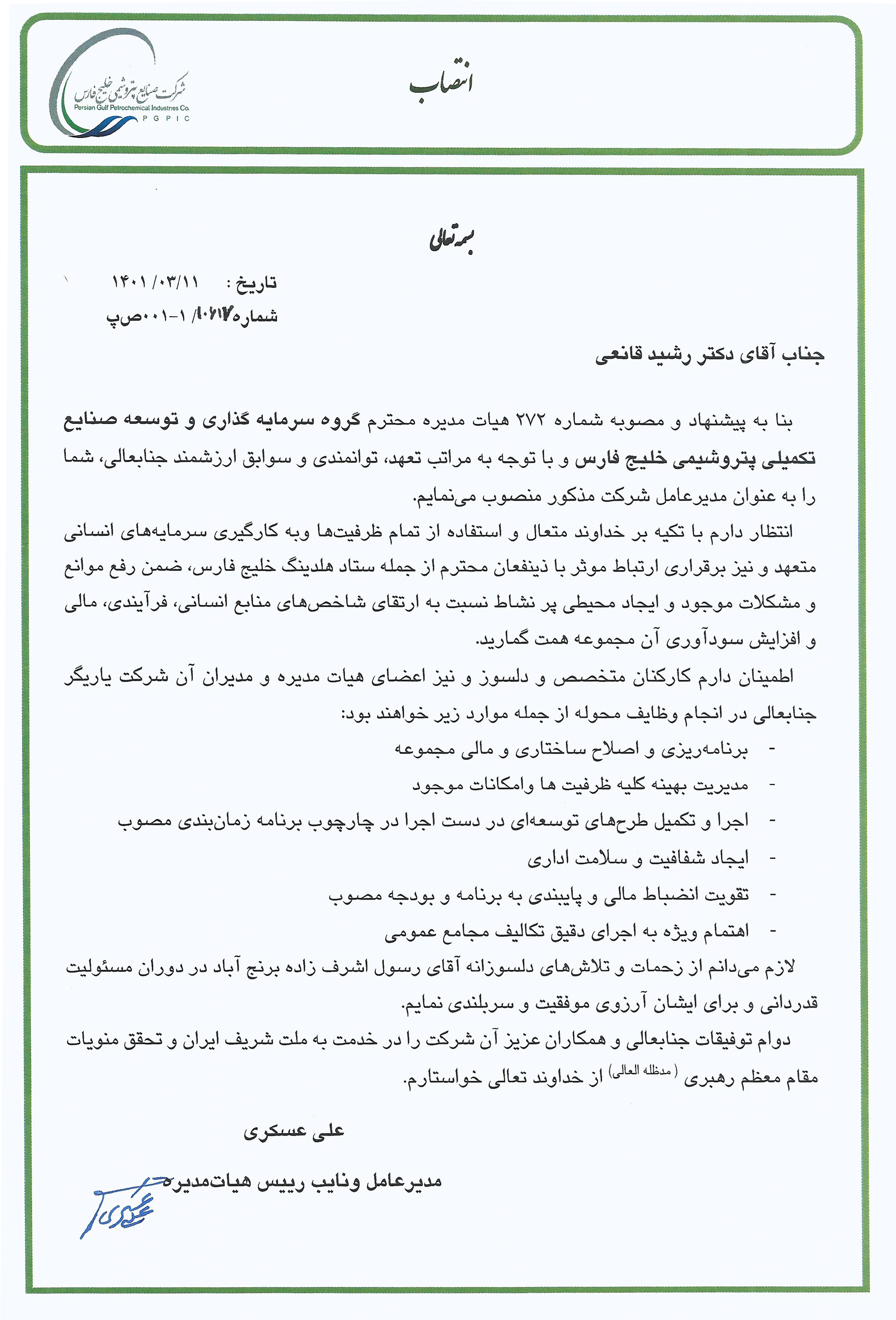 بنا به پیشنهاد و مصوبه شماره 272 هیات مدیره محترم گروه سرمایه گذاری و توسعه صنایع تکمیلی پتروشیمی خلیج فارس و با توجه به مراتب تعهد، توانمندی و سوابق ارزشمند جنابعالی، شما را به عنوان مدیر عامل شرکت مذکور منصوب می نمایم.