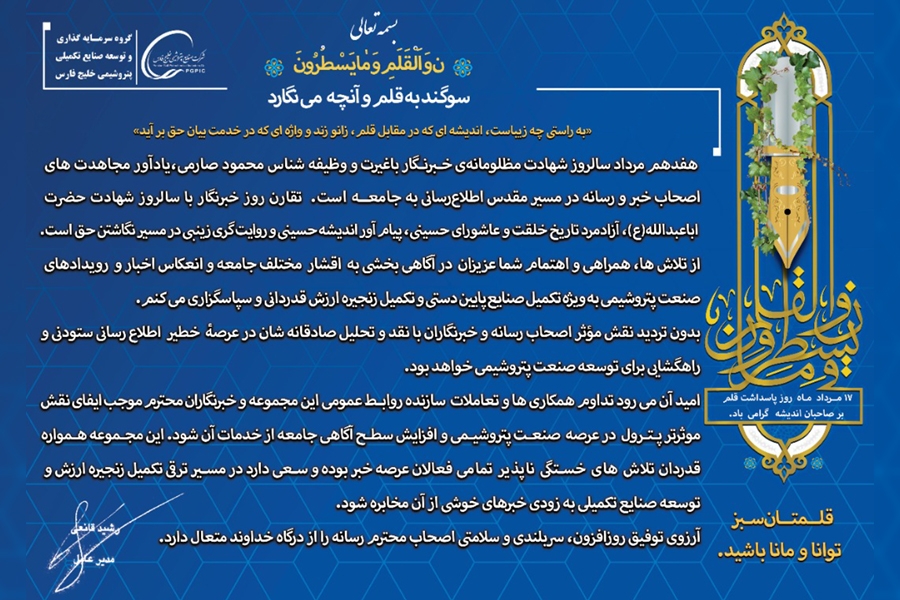 رشید قانعی مدیرعامل گروه سرمایه گذاری و توسعه صنایع تکمیلی پتروشیمی خلیج فارس، روز خبرنگار راتبریک گفت