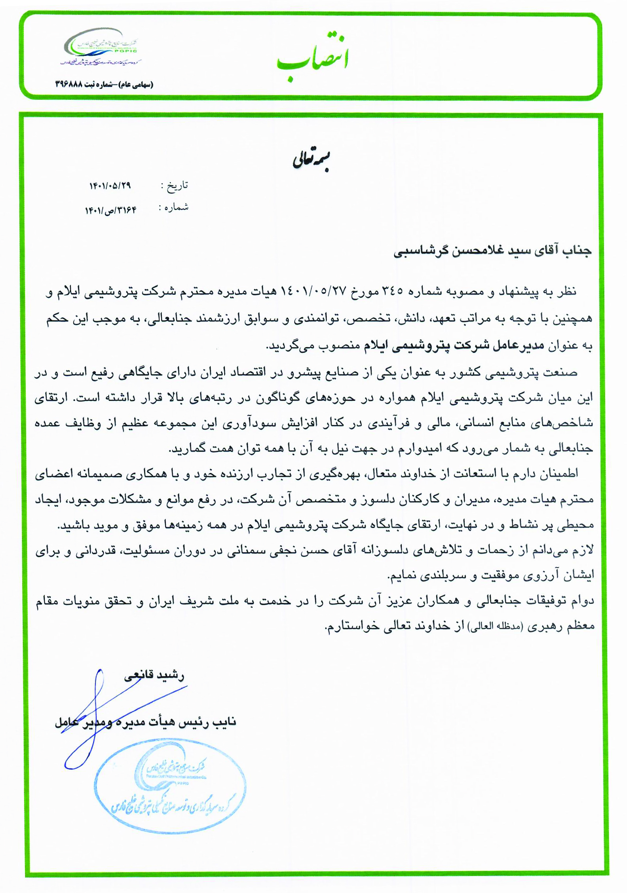 نظر به پیشنهاد و مصوبه شماره 345 مورخ 27/05/1401 هیات مدیره محترم شرکت پتروشیمی ایلام و همچنین با توجه به مراتب تعهد، دانش، تخصص، توانمندی و سوابق ارزشمند جنابعالی، به موجب این حکم به عنوان مدیرعامل شرکت پتروشیمی ایلام منصوب میگردید.