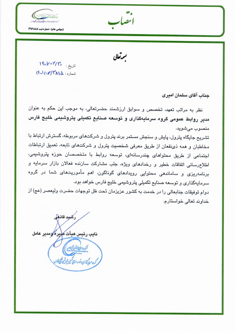 نظر به مراتب تعهد، تخصص و سوابق ارزشمند حضرتعالی، به موجب این حکم به عنوان مدیر روابط عمومی گروه سرمایهگذاری و توسعه صنایع تکمیلی پتروشیمی خلیج فارس منصوب می شوید.