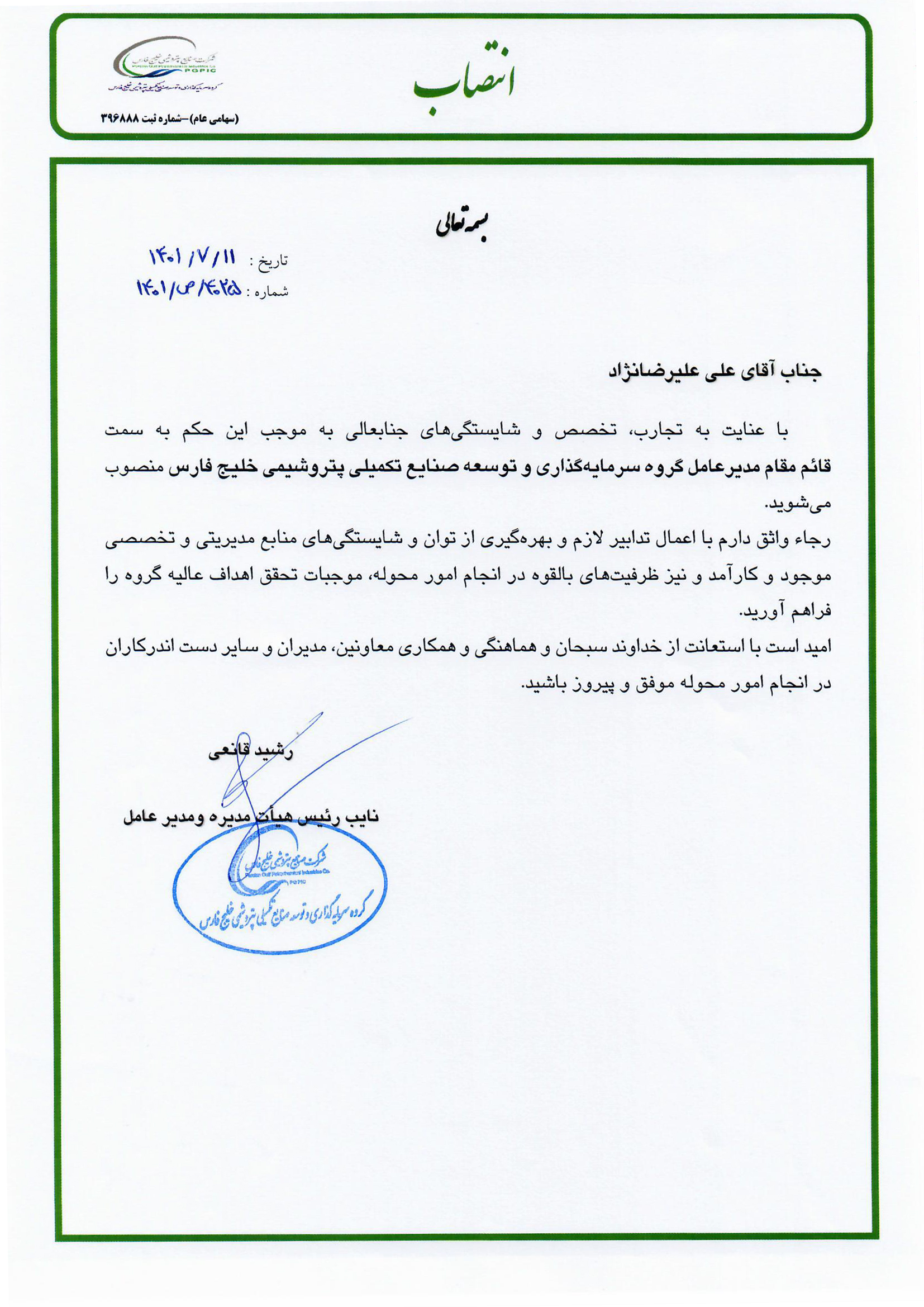با عنایت به تجارب، تخصص و شایستگیهای جنابعالی به موجب این حکم به سمت قائم مقام مدیرعامل گروه سرمایهگذاری و توسعه صنایع تکمیلی پتروشیمی خلیج فارس منصوب میشوید.