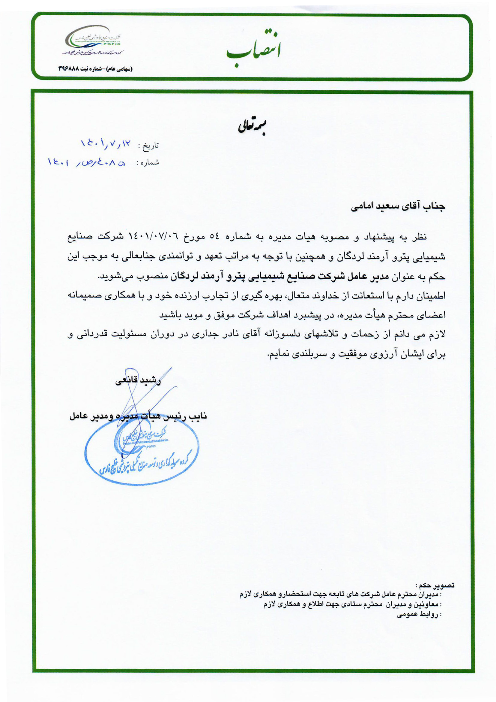 نظر به پیشنهاد و مصوبه شماره 54 مورخ 06/07/1401 هیات مدیره محترم شرکت صنایع شیمیایی پترو آرمند لردگان و همچنین با توجه به مراتب تعهد و توانمندی جنابعالی به موجب این حکم به عنوان مدیر عامل شرکت صنایع شیمیایی پترو آرمند لردگان منصوب می گردید.