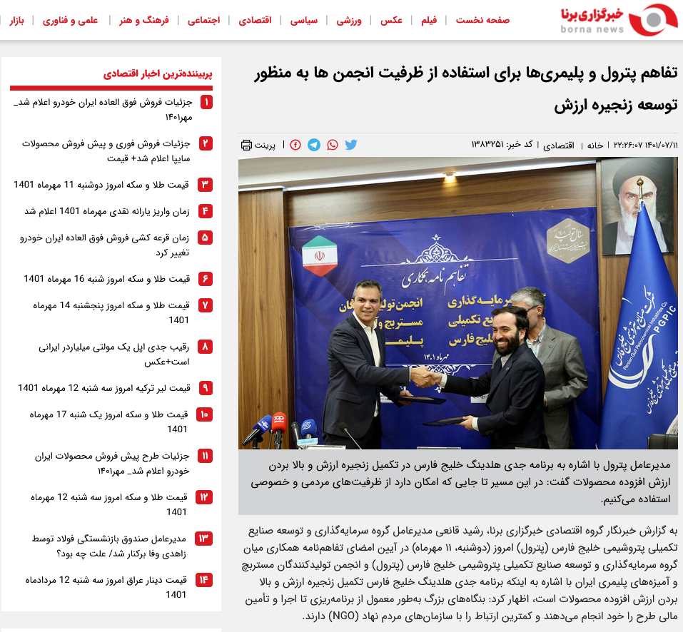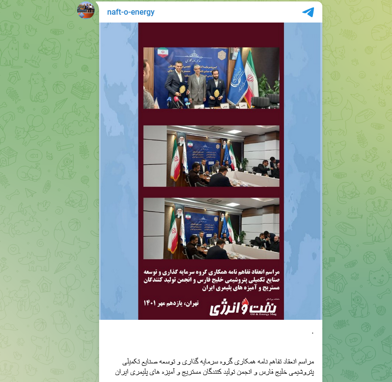 به گزارش روابط عمومی پترول، روز دوشنبه ۱۱ مهرماه 1401 تفاهم نامه همکاری میان گروه سرمایهگذاری و توسعه صنایع تکمیلی پتروشیمی خلیج فارس (پترول) و انجمن تولیدکنندگان مستربچ و آمیزههای پلیمری ایران امضا شد.