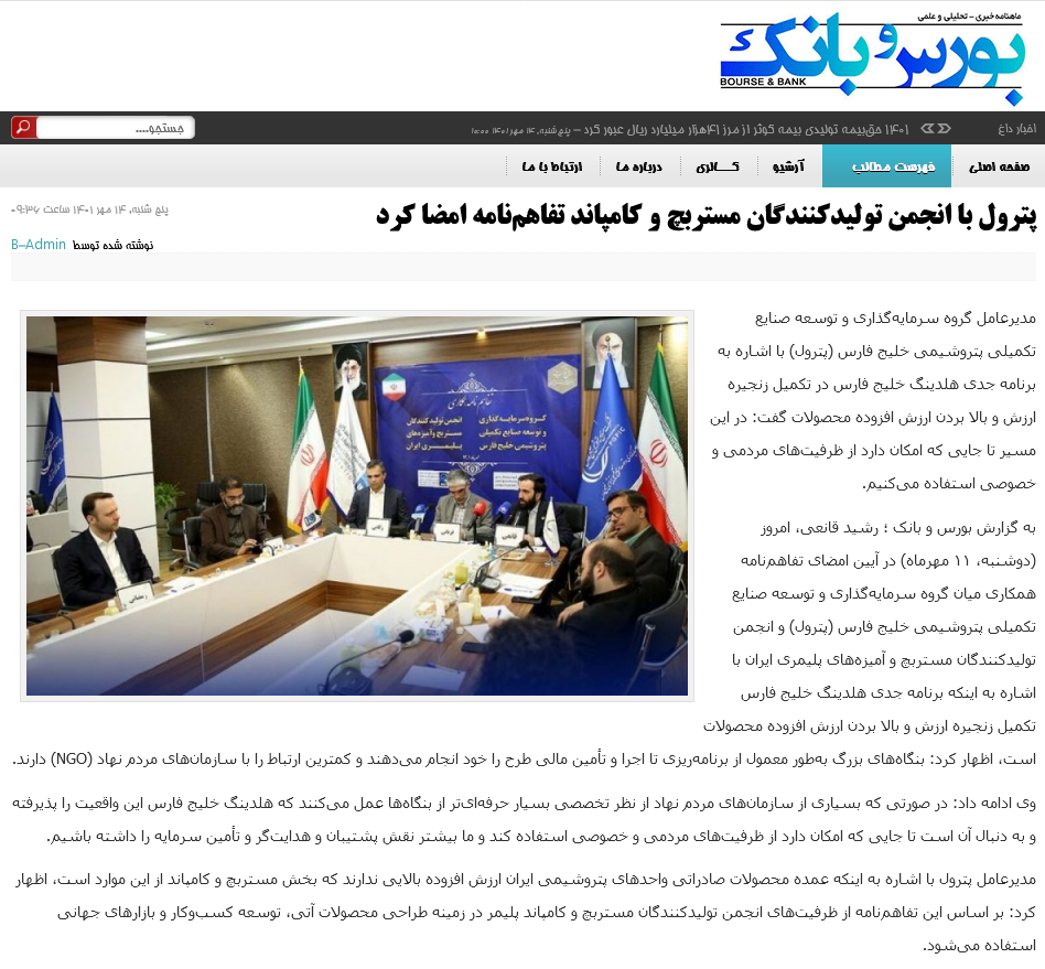 بورس و بانک : پترول با انجمن تولیدکنندگان مستربچ و کامپاند تفاهمنامه امضا کرد