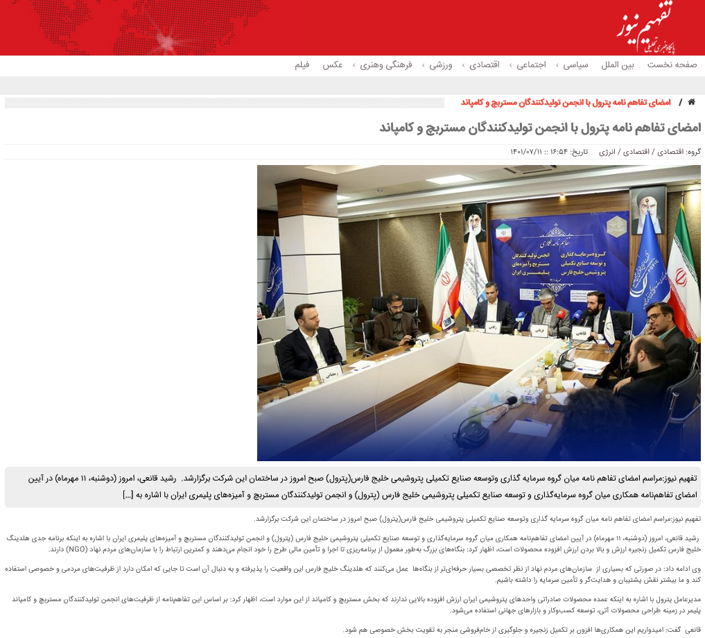 تفهیم نیوز: امضای تفاهم نامه پترول با انجمن تولیدکنندگان مستربچ و کامپاند