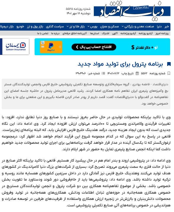 دنیای اقتصاد: برنامه پترول برای تولید مواد جدید