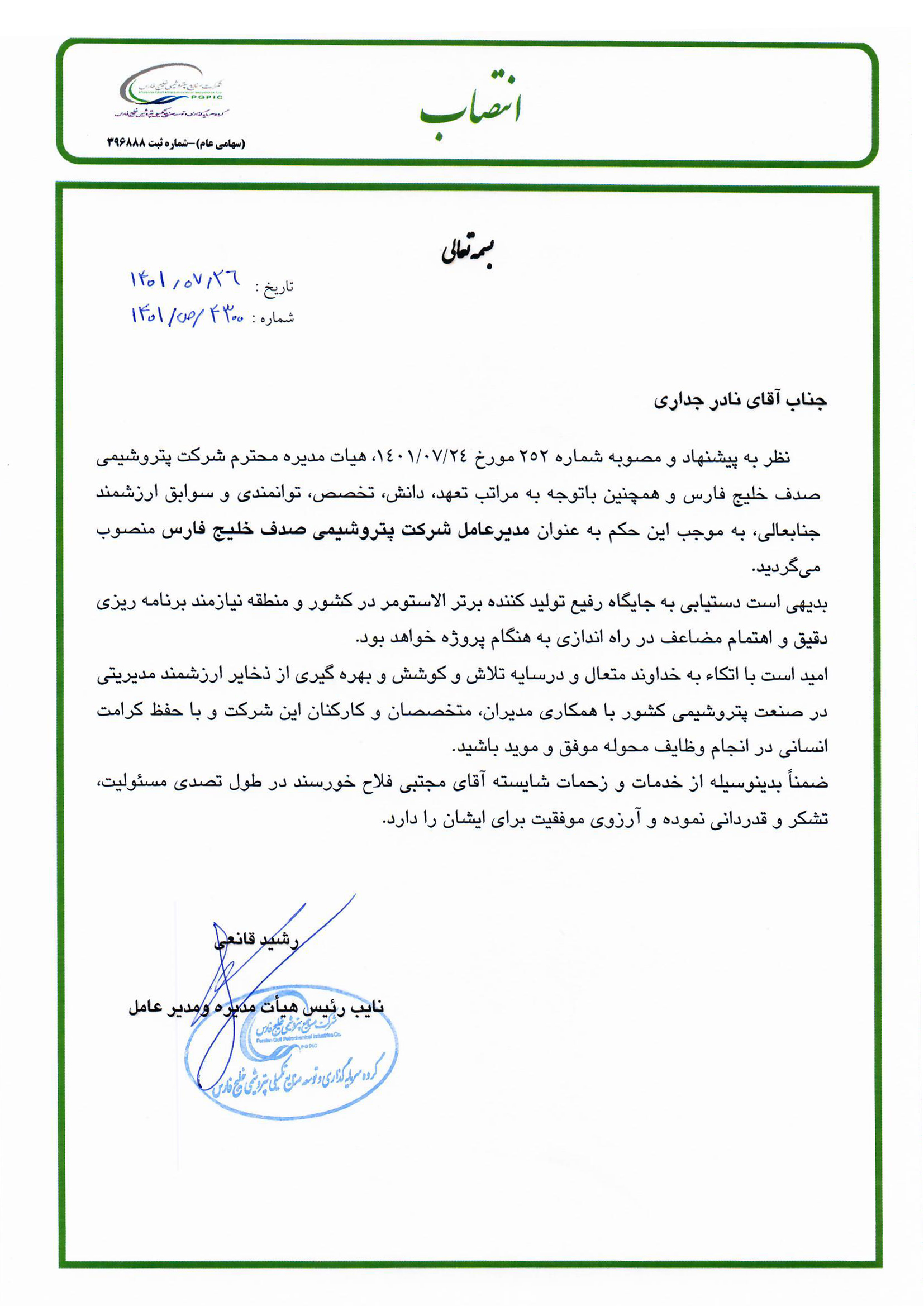 نظر به پیشنهاد و مصوبه شماره 252 مورخ 24/07/1401، هیات مدیره محترم شرکت پتروشیمی صدف خلیج فارس و همچنین باتوجه به مراتب تعهد، دانش، تخصص، توانمندی و سوابق ارزشمند جنابعالی، به موجب این حکم به عنوان مدیرعامل شرکت پتروشیمی صدف خلیج فارس منصوب میگردید.