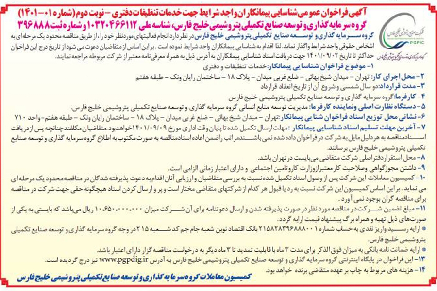 گروه سرمایه گذاری و توسعه صنایع تکمیلی پتروشیمی خلیج فارس در نظر دارد انجام فعالیتهای موردنظر خود را ، از طریق مناقصه محدود یک مرحلهای به اشخاص حقوقی واجد شرایط واگذار نماید. لذا اقدام به شناسایی پیمانکاران واجد شرایط نموده است . بر این اساس از متقاضیان دعوت می شود از تاریخ درج این فراخوان حداکثر تا تاریخ 02/09/1401 جهت دریافت اسناد شناسایی پیمانکاران به آدرس ذیل به همراه معرفینامه معتبر از شرکت مربوطه مراجعه نمایند.