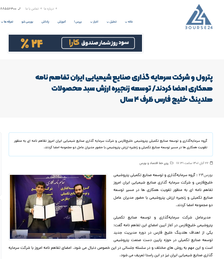 تفاهم نامه همکاری که میان گروه سرمایه گذاری و توسعه صنایع تکمیلی پتروشیمی خلیج فارس با شرکت سرمایهگذاری صنایع شیمیایی ایران به منظور تقویت همکاری ها در مسیر توسعه صنایع تکمیلی و زنجیره ارزش پتروشیمی انجام شد با حضور خبرنگاران از رسانه های مختلف داخلی همراه بود.