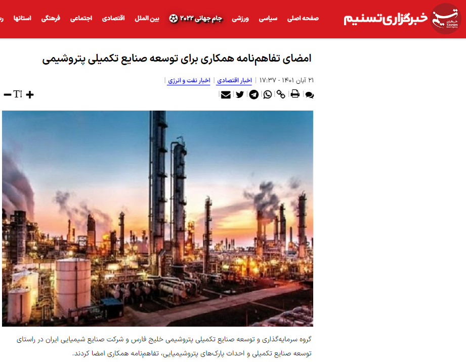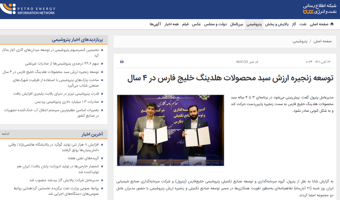 انعکاس خبر امضا تفاهم نامه پترول با شرکت سرمایهگذاری صنایع شیمیایی ایران