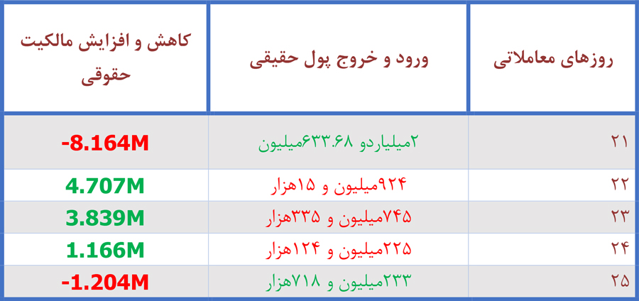 در روز شنبه 21آبان ماه بیشترین پول حقیقی در این نماد تزریق شد همچنین ، بیشترین درصد مالکیت در روز یکشنبه 22آبان توسط حقوقی های سهم اتفاق افتاد، این در حالی است که روز شنبه بیشترین کاهش مالکیت را توسط حقوقی های سهم شاهد بودیم.