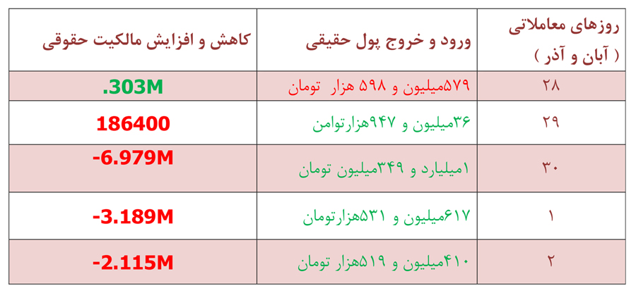 در روزدو شنبه 30آبان ماه بیشترین پول حقیقی در این نماد تزریق شد همچنین ، بیشترین درصد مالکیت در روز شنبه 28آبان توسط حقوقی های سهم اتفاق افتاد، این در حالی است که روز دوشنبه بیشترین کاهش مالکیت را توسط حقوقی های سهم شاهد بودیم و در تمام هفته حقیقی ها استقبال خوبی از نماد این شرکت داشتند.
