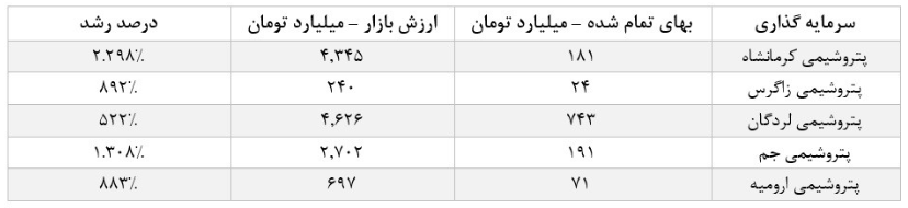 در پایان آذر ماه 1401 ، ارزش بازار سبد سرمایه گذاری بورسی شرکت به 15 همت رسیده که بیانگر رشد 942%سرمایه گذاری اولیه است. در جدول مقایسه ای بین سرمایه گذاری اولیه و ارزش بازار برخی از سرمایه گذاری ها ارائه شده است: