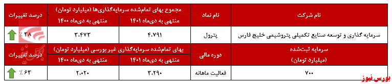 به گزارش روابط عمومی پترول، سرمایه گذاری و توسعه صنایع تکمیلی پتروشیمی خلیج فارس در گزارش فعالیت ماهانه دیماه سال ۱۴۰۱ توانست مجموع بهای تمامشده سرمایهگذاریهای خود را مبلغی بالغبر ۴ هزار و ۷۹۱ میلیارد تومان شناسایی کند، این سرمایهگذاریها حاصل از سرمایهگذاری در بازار سرمایه و خارج از بازار سهام شکل گرفت.