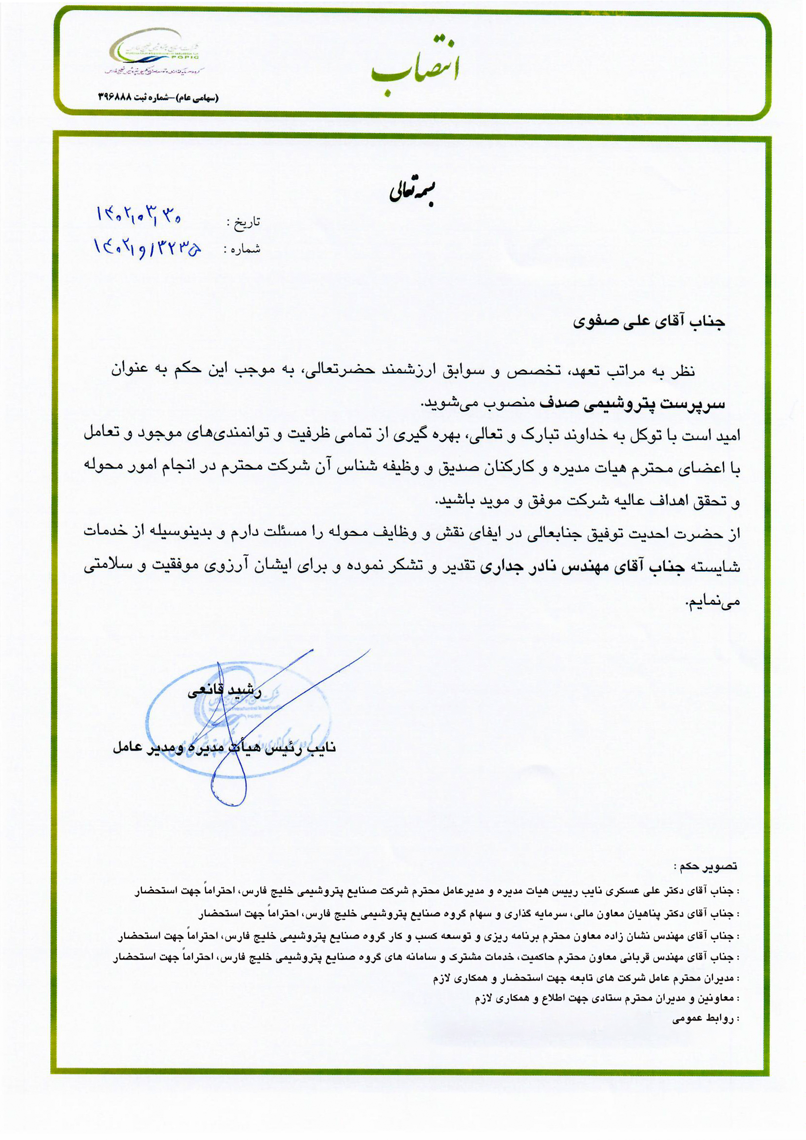 مدیرعامل پترول در حکمی «علی صفوی» را به عنوان سرپرست جدید پتروشیمی صدف خلیجفارس منصوب کرد.