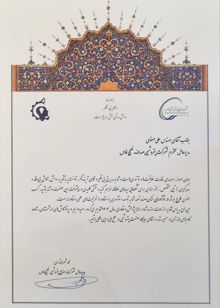 به گزارش روابط عمومی پترول، در متن لوح تقدیمی به علی صفوی، مدیرعامل پتروشیمی صدف خلیجفارس، که با امضای دکتر محمد شریعتمداری، مدیرعامل شرکت صنایع پتروشیمی خلیجفارس همراه است، آمده است: