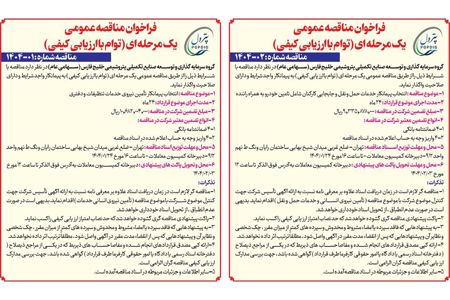 گروه سرمایه گذاری و توسعه صنایع تکمیلی پتروشیمی خلیج فارس سهامی عام در نظر دارد مناقصه با شرایط ذیل را از طریق مناقصه عمومی یک مرحله ای توام با ارزیابی کیفی ) به پیمانکار واجد شرایط و دارای صلاحیت واگذار نماید.