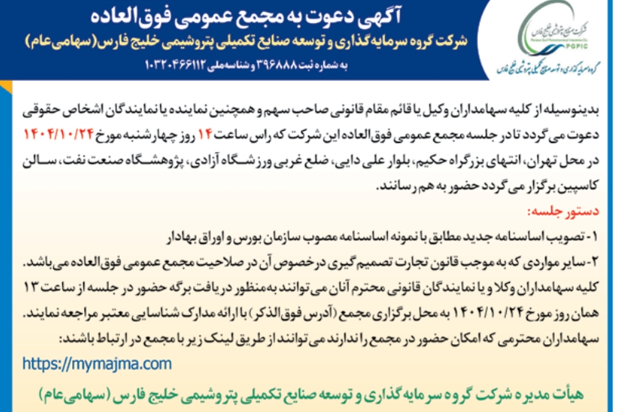 بدین وسیله از کلیه سهامداران وکیل یا قائم مقام قانونی صاحب سهم و همچنین نماینده یا نمایندگان اشخاص حقوقی دعوت میگردد تا در جلسه مجمع عمومی فوق العاده این شرکت که راس ساعت 14 روز چهارشنبه مورخ 24/10/1404 در محل تهران، انتهای بزرگراه حکیم، بلوار علی دایی، ضلع غربی ورزشگاه آزادی، پژوهشگاه صنعت نفت، سالن کاسپین برگزار میگردد حضور به هم رسانند.