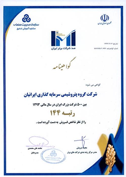 كسب رتبه 144از بين 500 شركت بزرگ ايران از نظر شاخص فروش در سال 1393