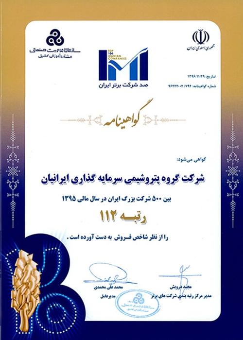 كسب رتبه 112 از بين 500 شركت بزرگ ايران از نظر شاخص فروش در سال 1395