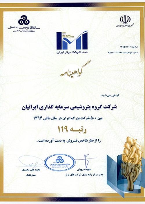 كسب رتبه 119 از بين 500 شركت بزرگ ايران از نظر شاخص فروش در سال 1394
